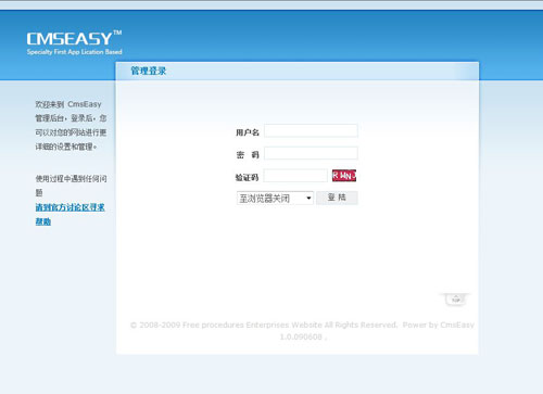 2、在用户名栏,填写安装时设定的用户名(默认为cmseasy)。 3、在密码栏中,填写安装时设定的密码(默认为cmseasy)。 4、选择登录保存时间 5、填写验证码(注意,验证码字母一律用大写!) 6、点击[登录]按钮,进行管理登录。 7、进入后台。