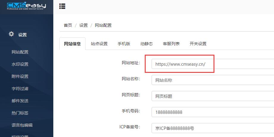 首先登录网站后台,点击 [ 设置 ] - [ 网站配置 ] ,在网站地址中检查是否为网站真实访问地址,如图: