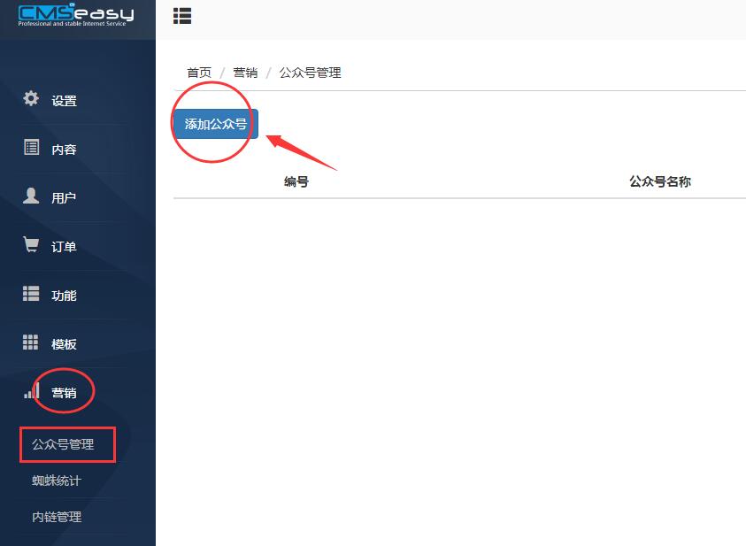 确定网站地址中的域名全称填写无误后,左侧 点击 [ 营销 ] - [ 微信公众号 ] 如图: