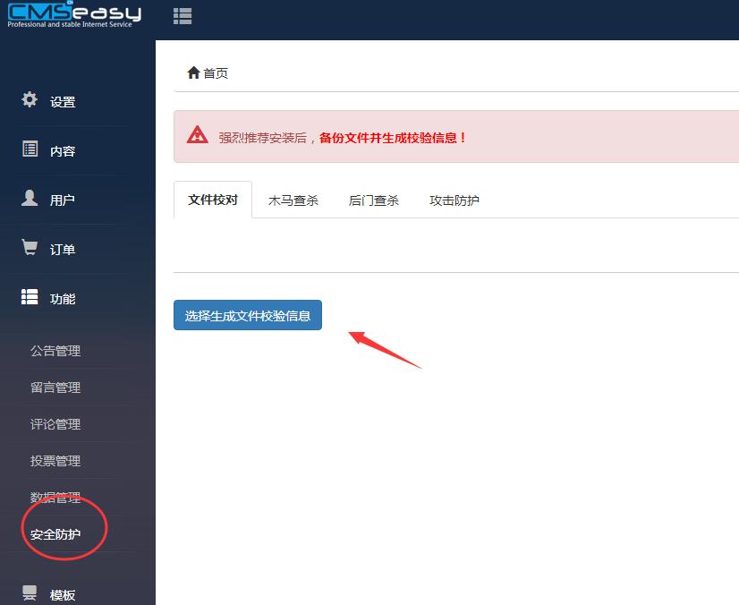 方法是登陆网站后台 - [ 功能 ] - [ 安全防护 ] - [ 文件校对 ] 生成指纹信息。