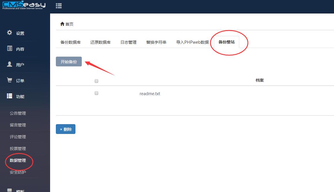 方法是网站后台 - [ 功能 ] - [ 数据管理 ] - [ 备份整站 ] 打包整站文件备份,且下载。